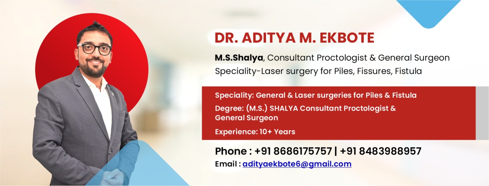 Our hospital is led by Dr. Aditya M. Ekbote, a skilled Consultant Proctologist and General Surgeon. With years of experience and a patient-first approach, Dr. Ekbote offers expert treatment using the latest laser surgery methods. He specializes in managing:
